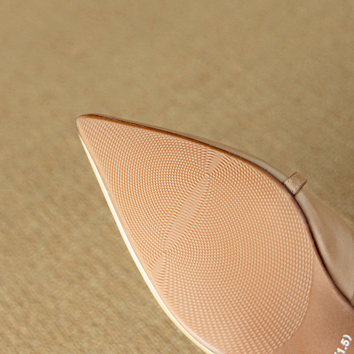 Delicate pearls and gold accents adorn the slim cross straps of these genuine leather heels, delivering soft comfort and understated glamour with every step.