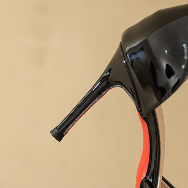 A glossy patent finish and iconic red sole create a tempting appeal to these high stiletto heels, crafted from premium genuine leather with a sharp pointed toe and an adjustable ankle strap.