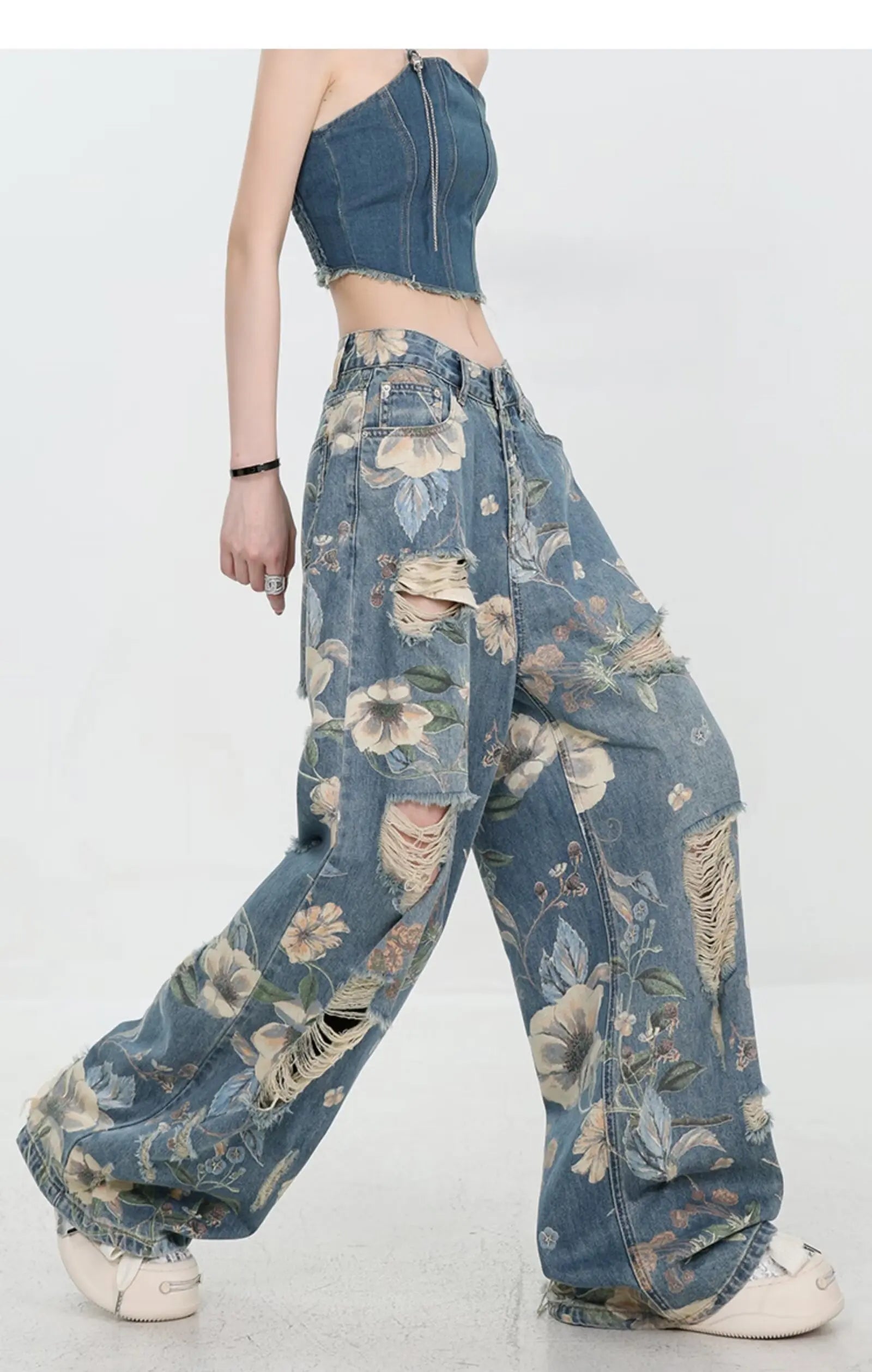 Flourish in chaos with these floral wide-leg jeans, ripped to perfection for lived-in, street-chic vibes, style them with your favorite top for a laid-back look.