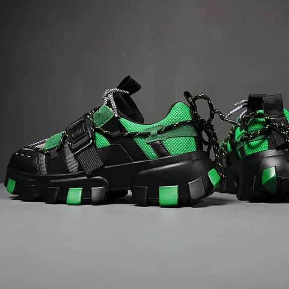 These future inspired sneakers balance rugged functionality and bold design. The oversized sole and buckle straps create aggressive and refined look while providing maximum shock absorption. Style them with cargo pants and a windbreaker for street-ready vibes.