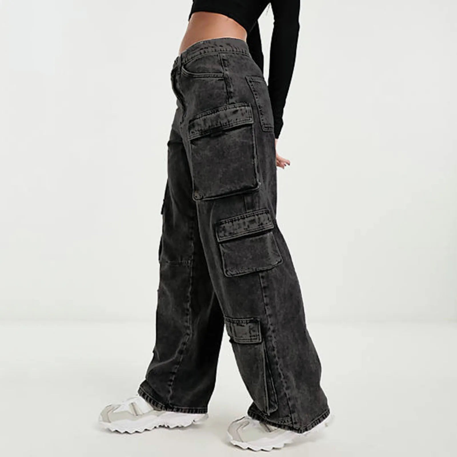 A distressed finish brings vintage charm to these denim cargo jeans that redefine streetwear with a relaxed wide-leg fit and a flattering high-rise waist, perfect for a bold vibe.