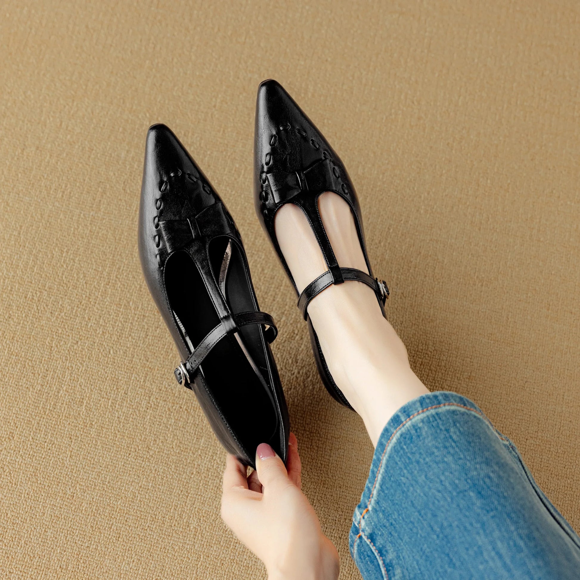 A sweet bow and graceful T-strap lend classic charm to these pointed-toe pumps, crafted from genuine leather with a cushioned insole and a wrapped wedge heel for subtle lift and lasting comfort.